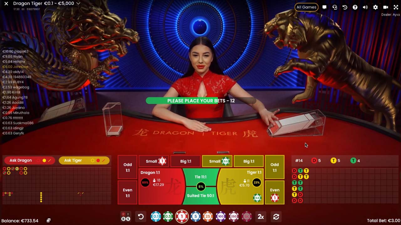 Dragon Tiger लाइव $0.10 से $50,000 तक के शानदार दांव आकार प्रदान करता है। खिलाड़ी टाइगर या ड्रैगन (1:1), टाई (11:1), और सूटेड टाई (50:1) N8 इंडिया ऑनलाइन कैसीनो और स्पोर्ट्स बेटिंग | सुरक्षित खेलें और हर दिन जीतेंपर दांव लगा सकते हैं। अन्य सभी दांव, जैसे विषम, सम, छोटे और बड़े, 1:1 का भुगतान करते हैं।